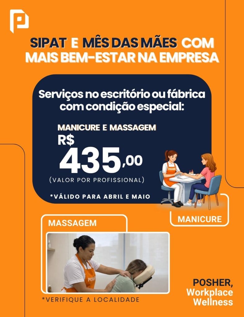 POSTADO POR: Ryan | 02, abril 2026 | SEJA O PRIMEIRO A COMENTARCom a SIPAT e o Mês das Mães se aproximando, a POSHER preparou uma condição especial para empresas que desejam levar ações de saúde e qualidade de vida para o escritório ou fábrica, como uma dia de massagem ou manicure. De R$ 525,00 (valor normal para eventos) Por R$ 435,00 (valor com desconto especial) Valor […]